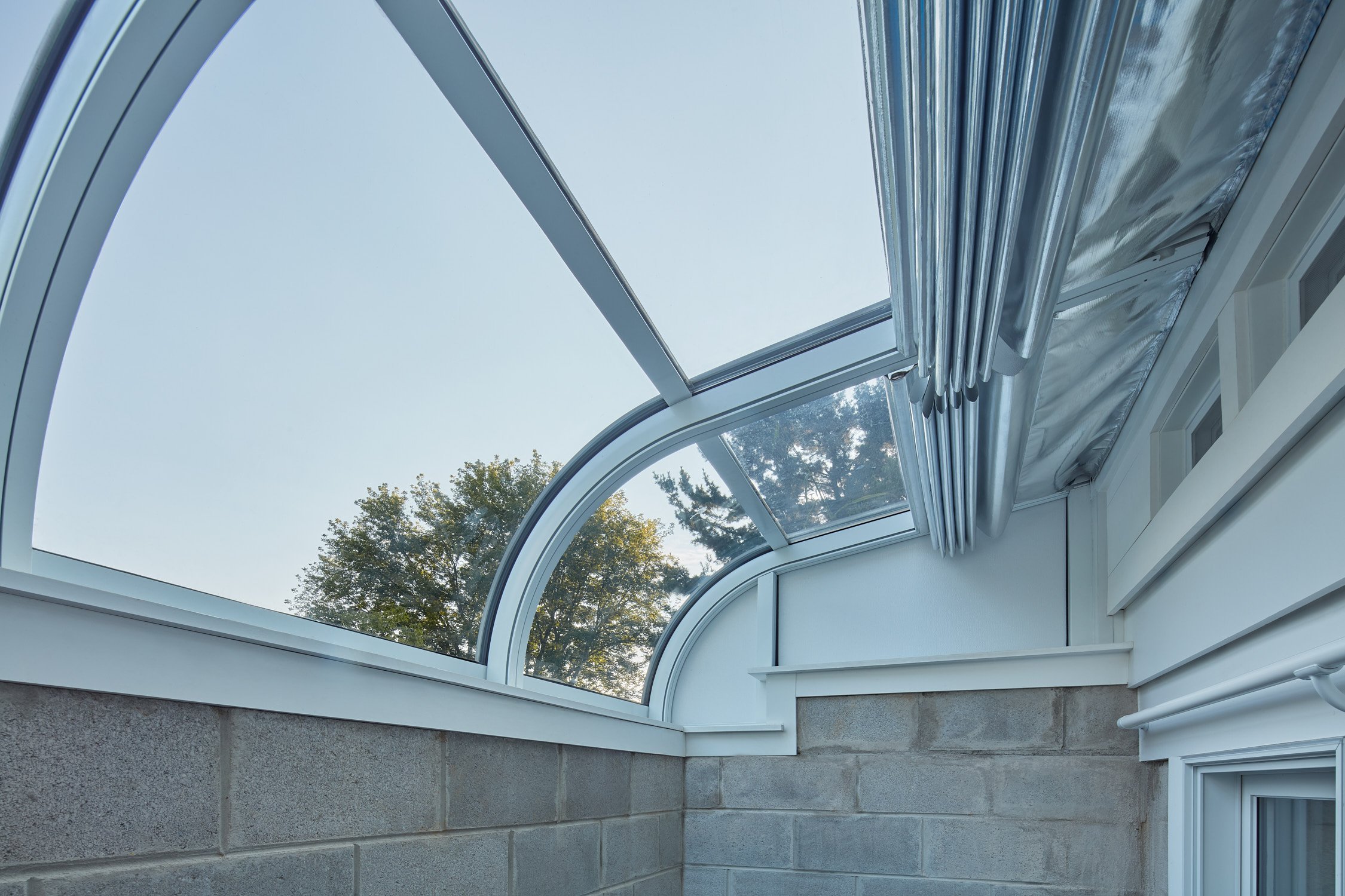 Below the living space, a basement clerestory anchors the south facade with a “green(house) well”, designed for year-round gardening and animal husbandry. Situated just below grade, the green well is positioned to not only harness the south-facing sun exposure, which it modulates with a retractable reflective shade, but also to leverage the insulating capacity of the earth around it. New operable windows on the basement side allow access into this space from the interior of the home while completing a thermal convection loop between the green well, the basement interior, and the great room above.