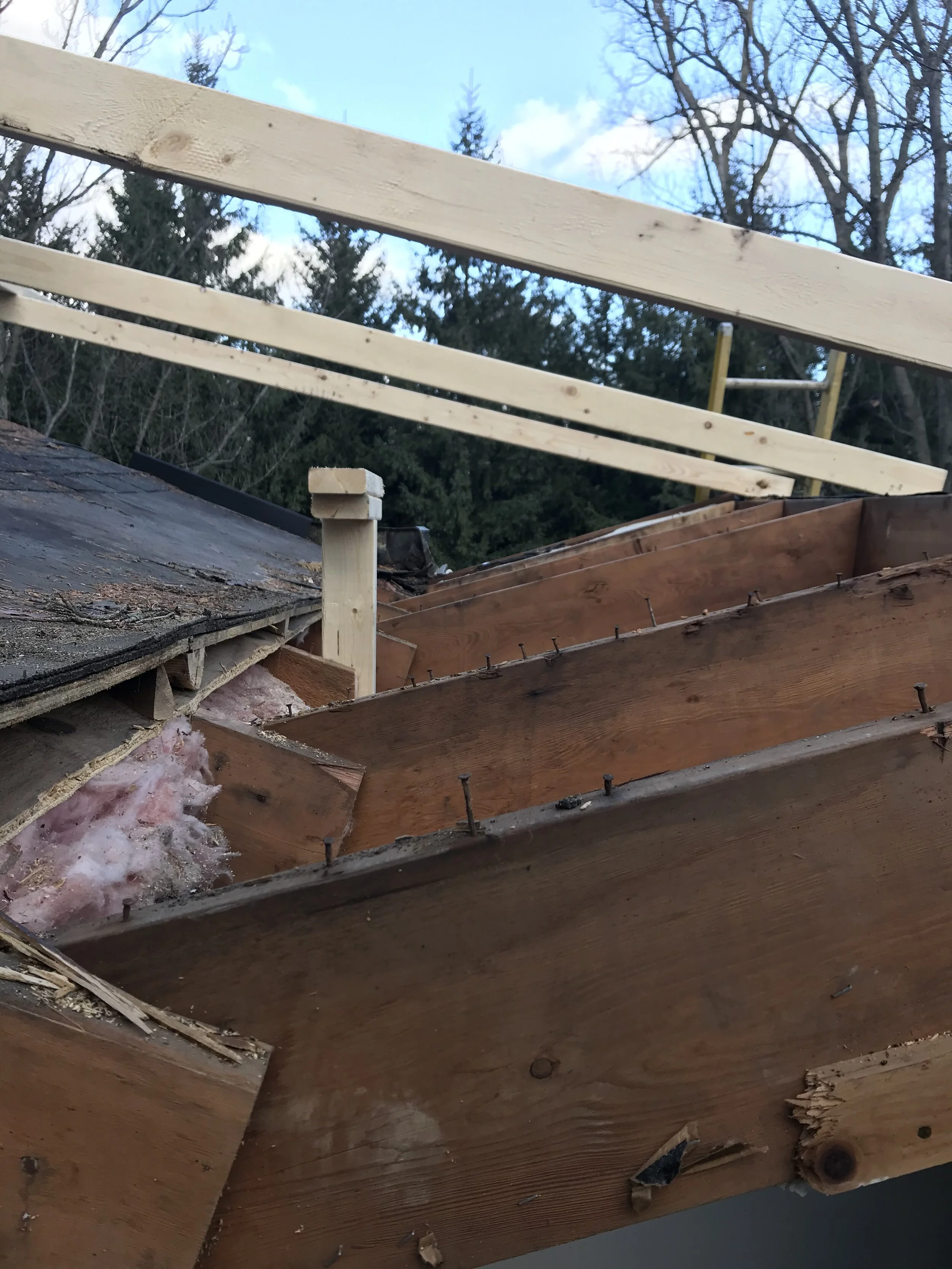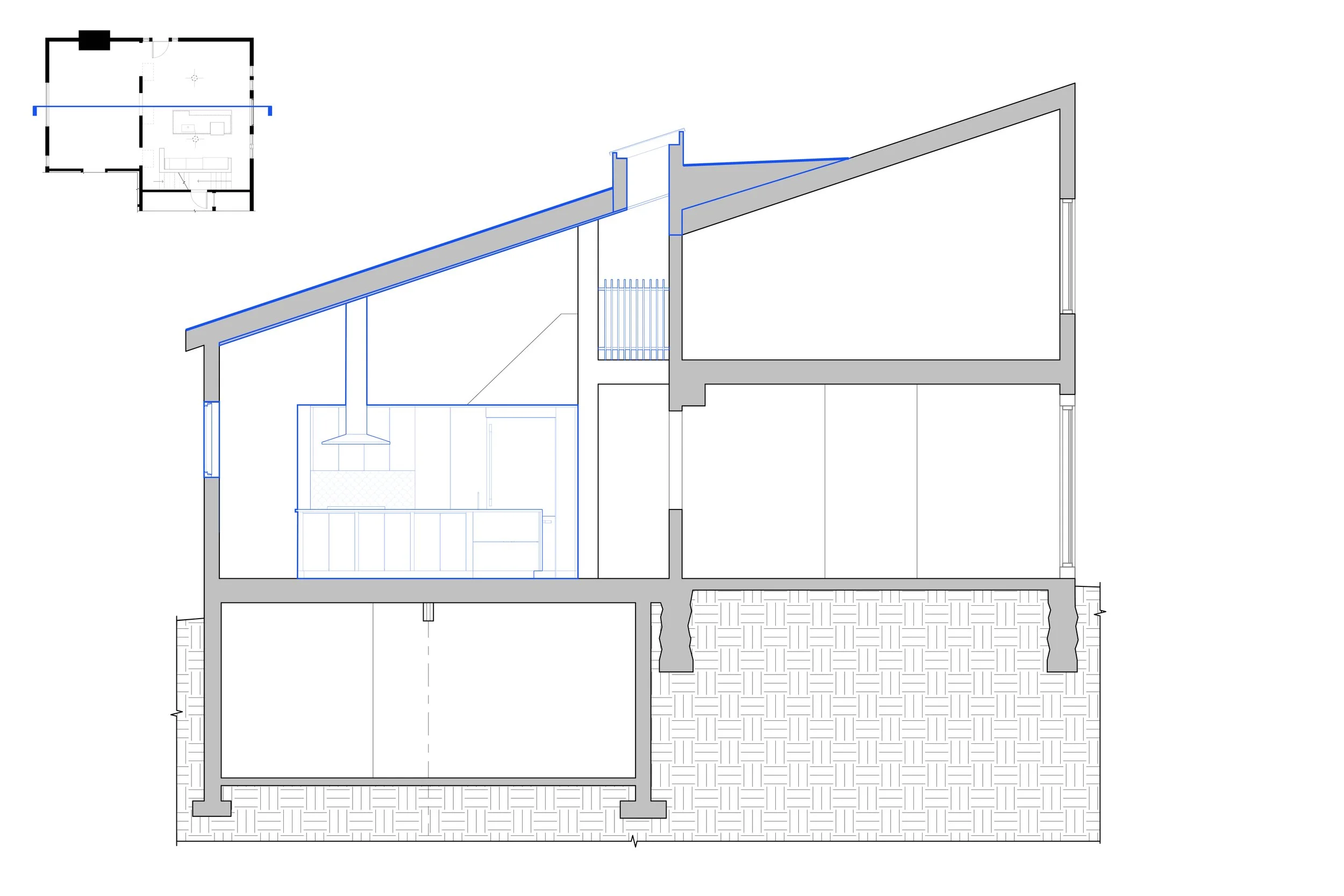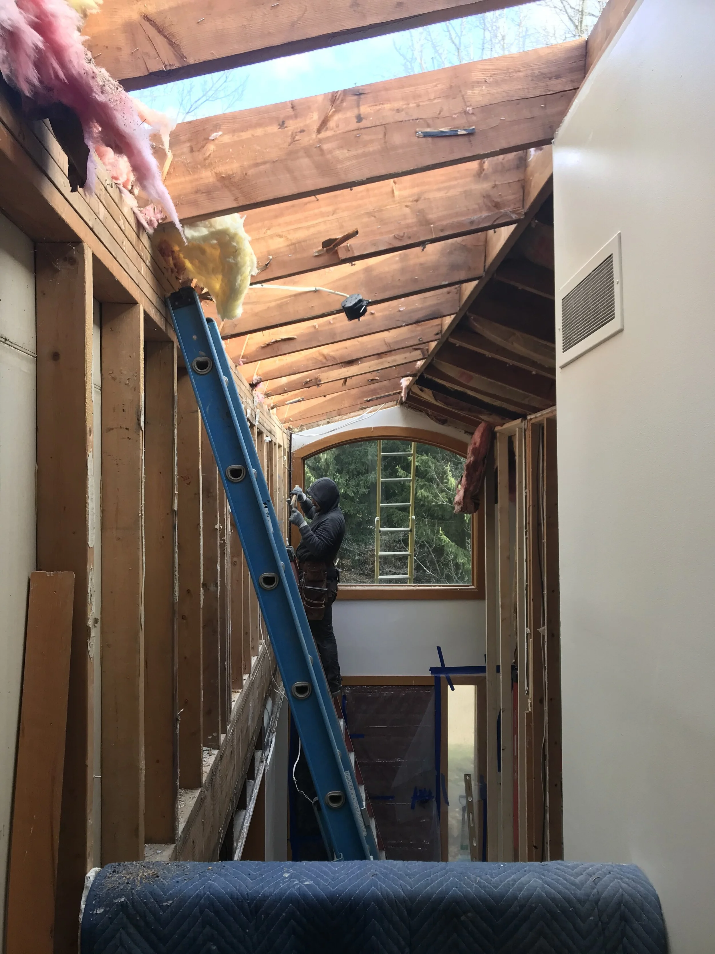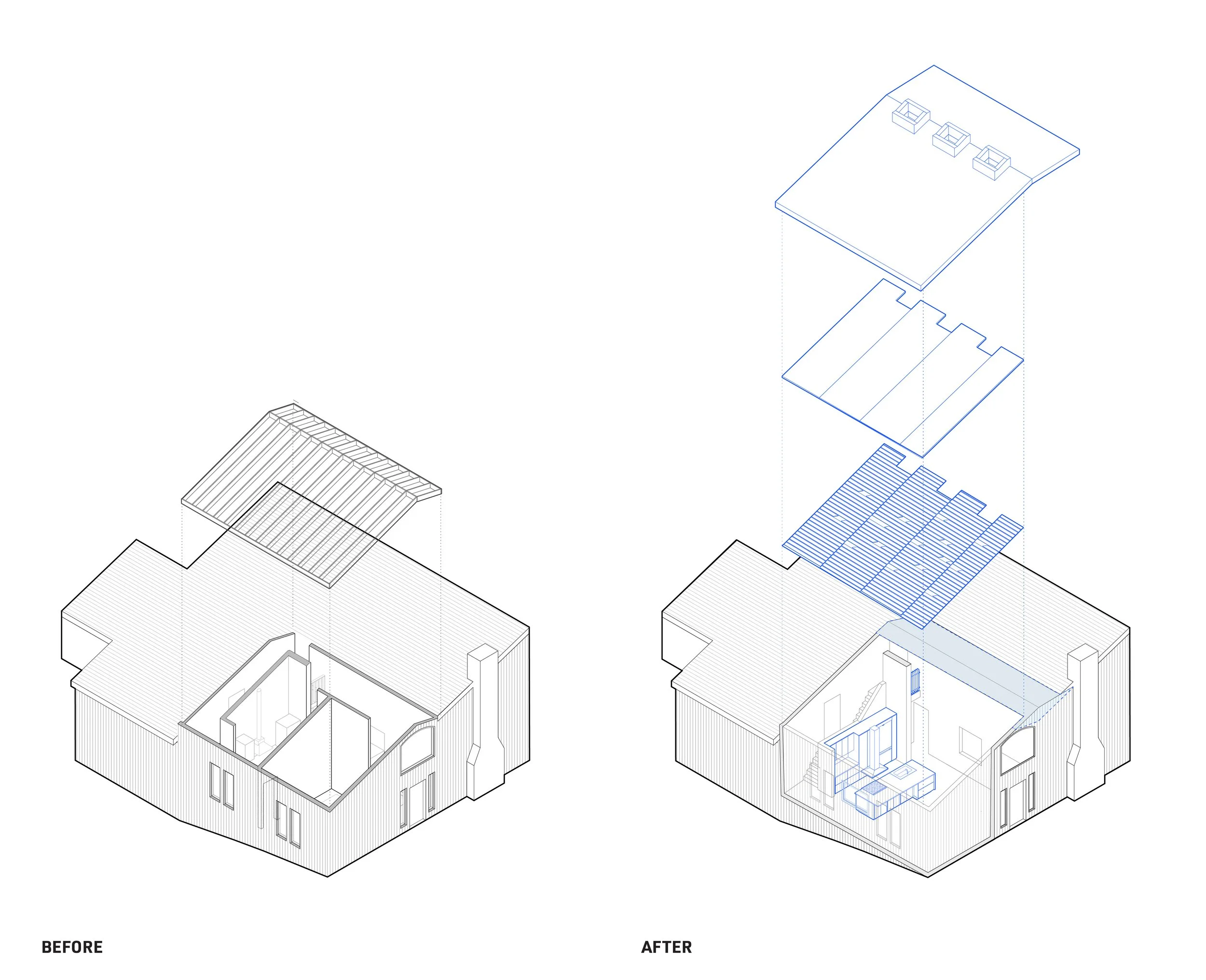 The redesign of the roof and ceiling systems attend to an array of distinct challenges present in the existing home. Geometric changes to the exterior eliminate a valley prone to leaking and thermal bridging. A new acoustically absorptive material assembly greatly enhances the acoustic comfort compared to the previous hard surfaces in high-ceiling spaces.
