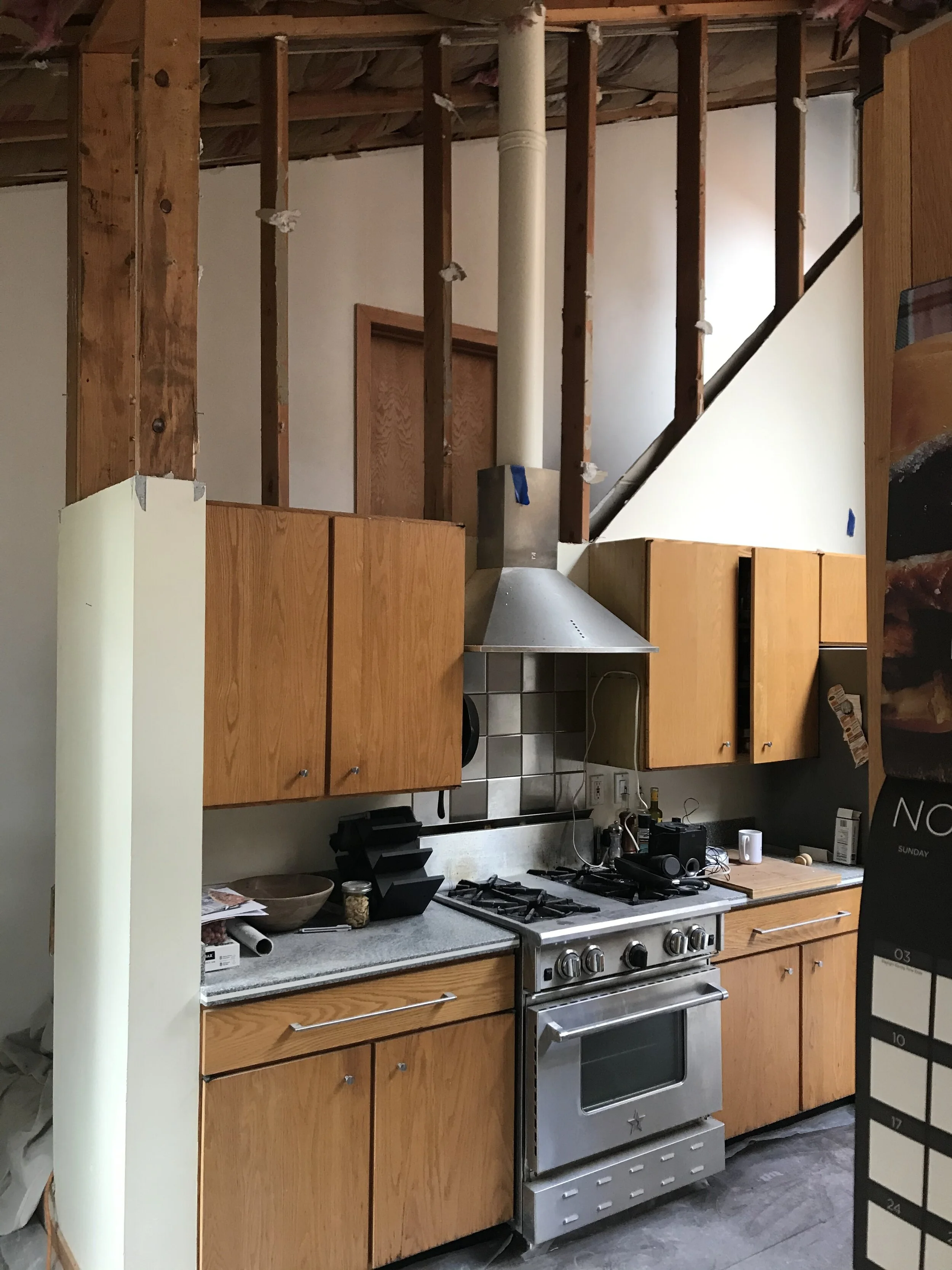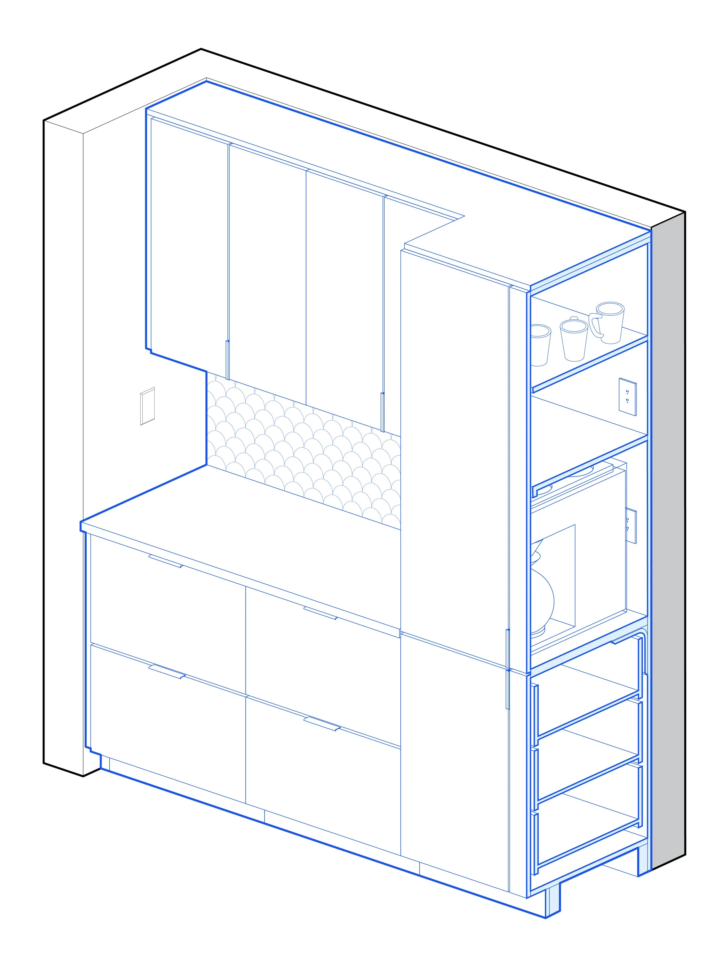 The new ceiling assembly includes layers of acoustic fabric as well as integrated new skylights and wafer lighting. The material palette of the project is further reinforced by bringing the ceiling’s maple wood to a custom guardrail and cabinetry in the kitchen below. Behind the wall of maple cabinet doors, the kitchen houses a diversity of custom cabinetry pieces, including toe-kick drawers, pull-out racks, and a “hide-away” countertop for appliances. Functioning like a swiss army knife of storage options, the kitchen supports an ability to maintain organization and multiple simultaneous uses inside of a relatively small footprint.