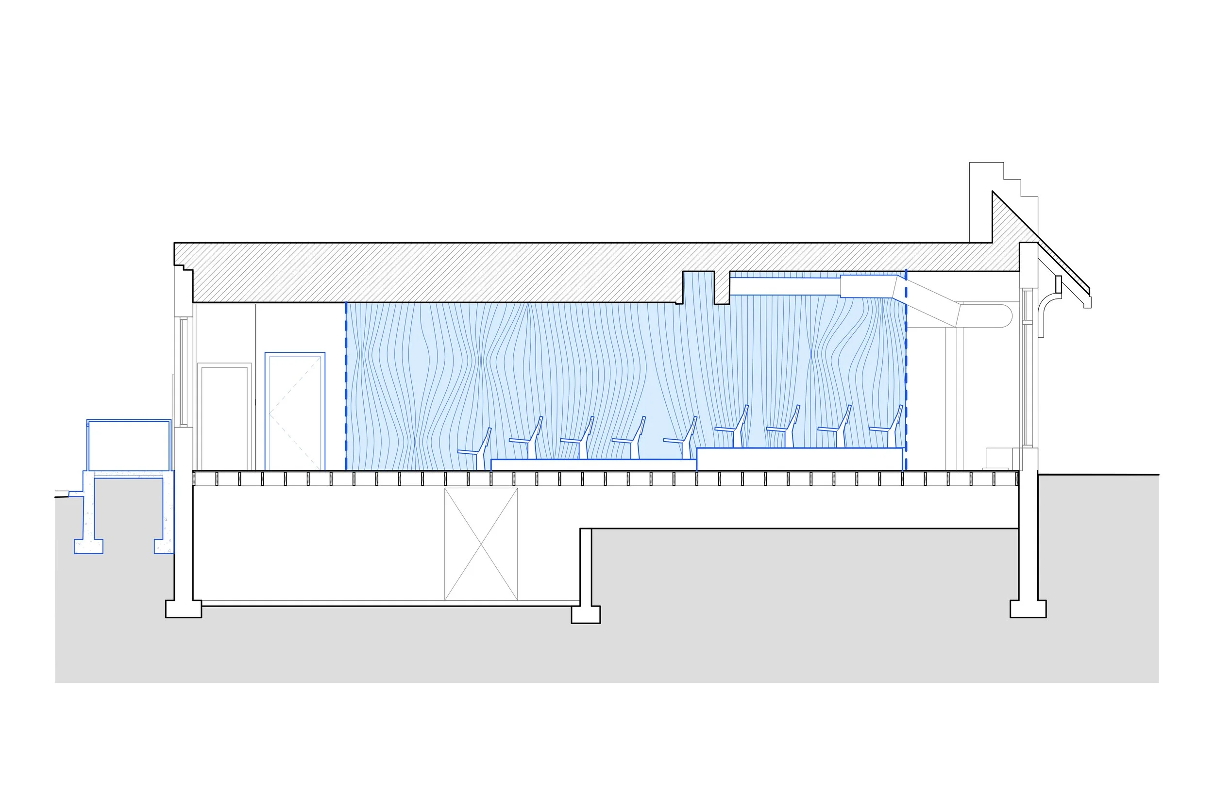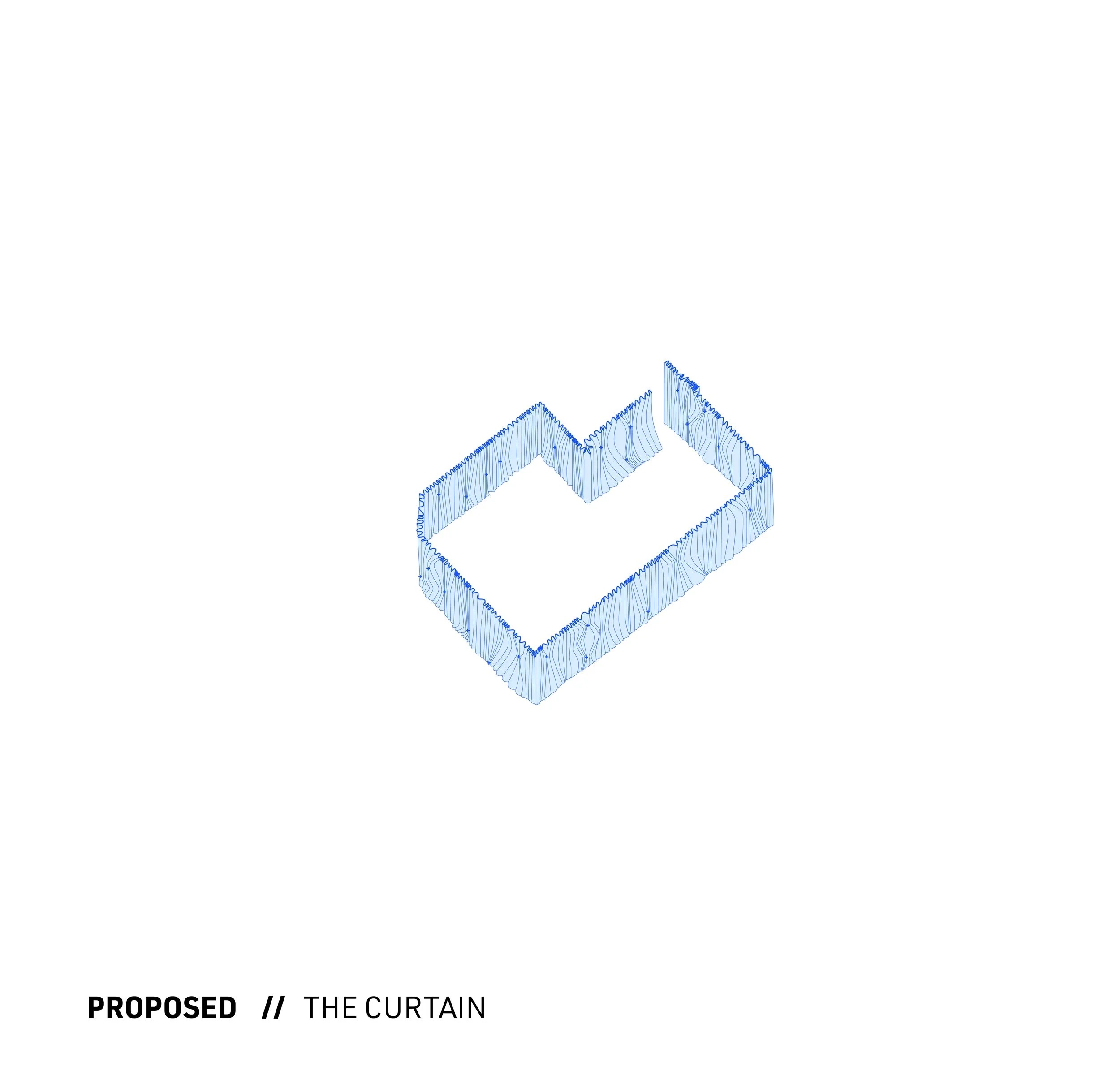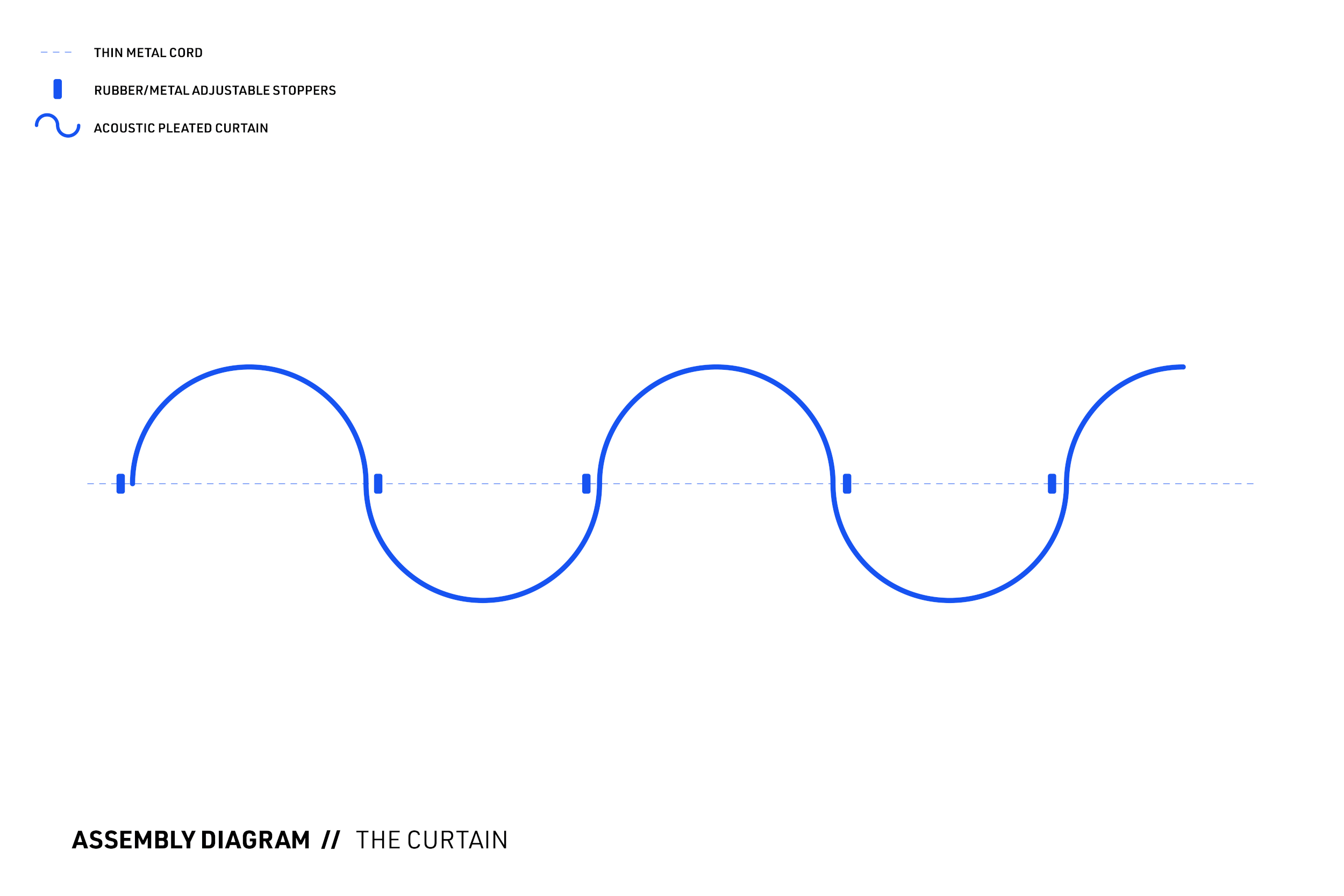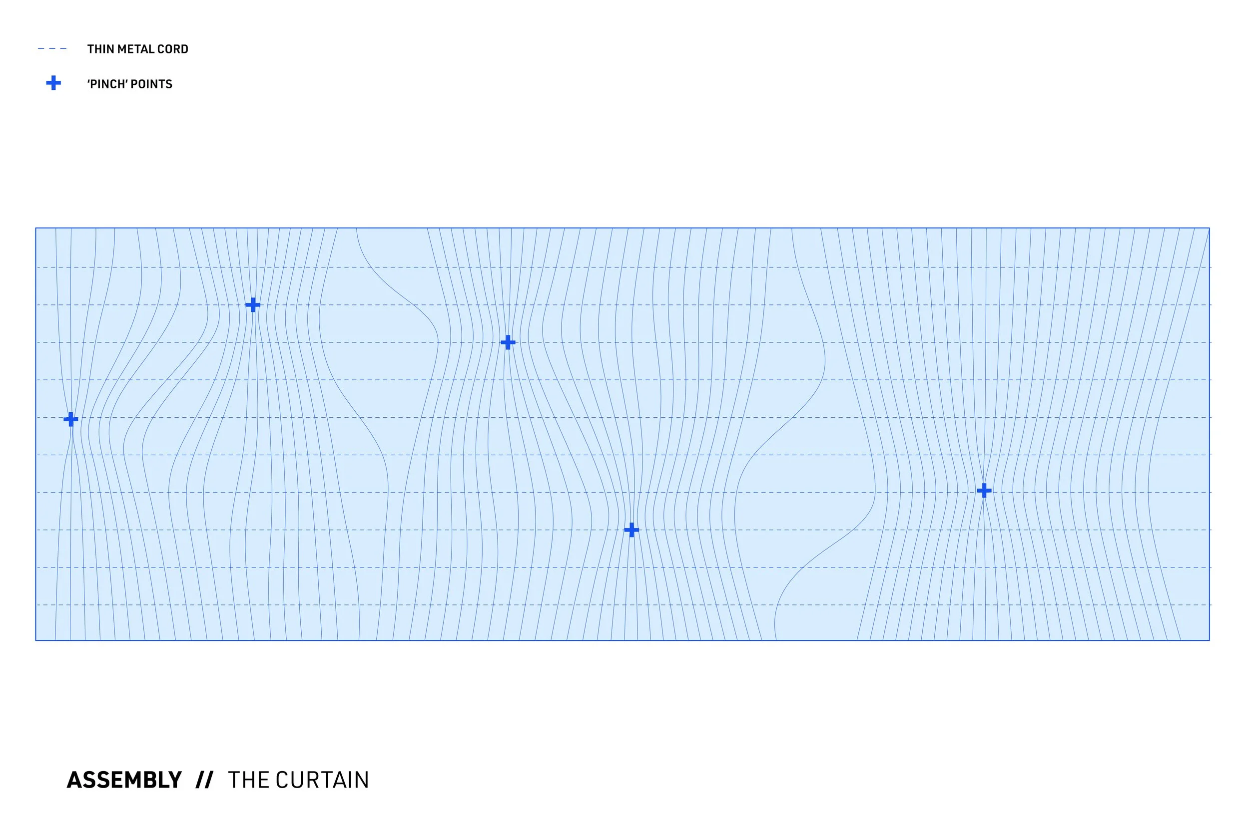 Within the theatre, a ceiling-mounted curtain defines the programmatic layout. Acting as a flexible, minimally invasive “wall,” the curtain allows the space to adapt functionally, while adding visual interest and identity. Parametrically designed, it responds to a series of intentional “pinch” points: thick acoustic fabric is pleated and threaded with thin metal cords, gathered at key intervals, and secured with rubber and metal stoppers. The undulating texture operates as a balance between the simplicity of the black box theatre and the articulated wall surface of a baroque theatre.