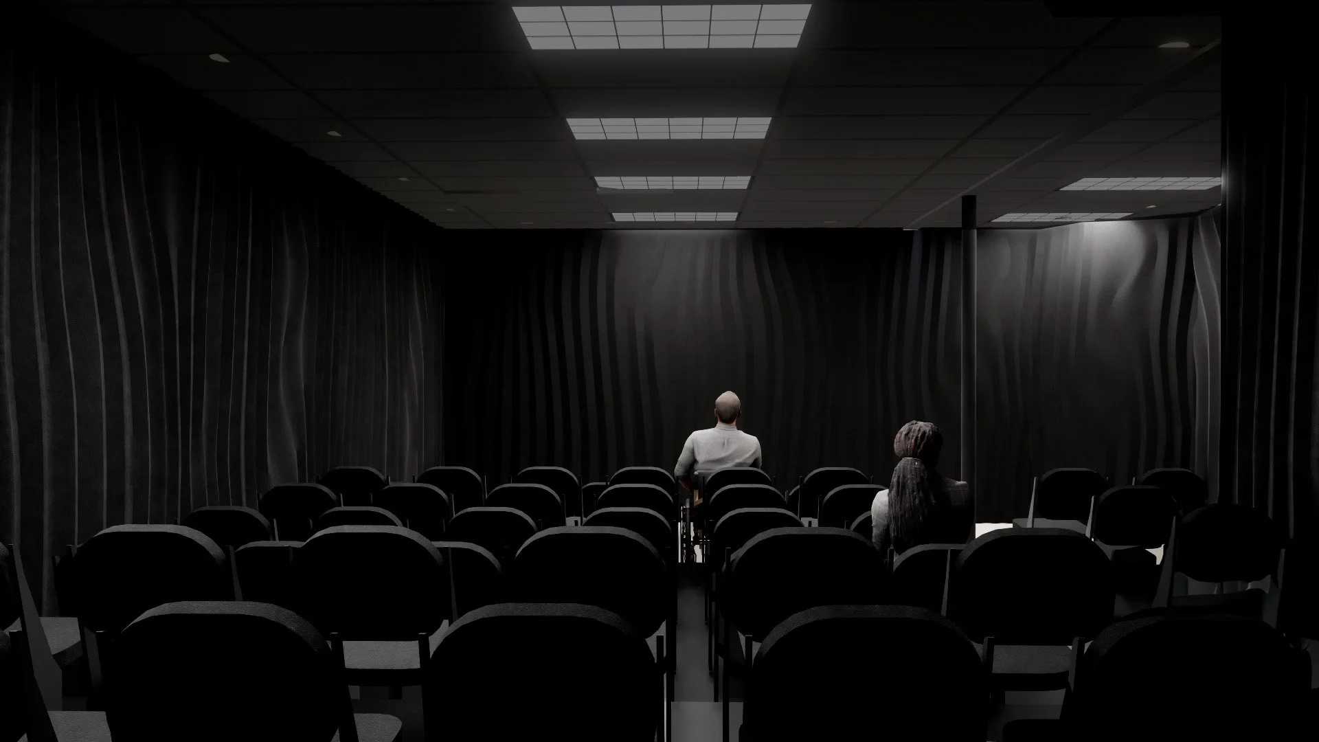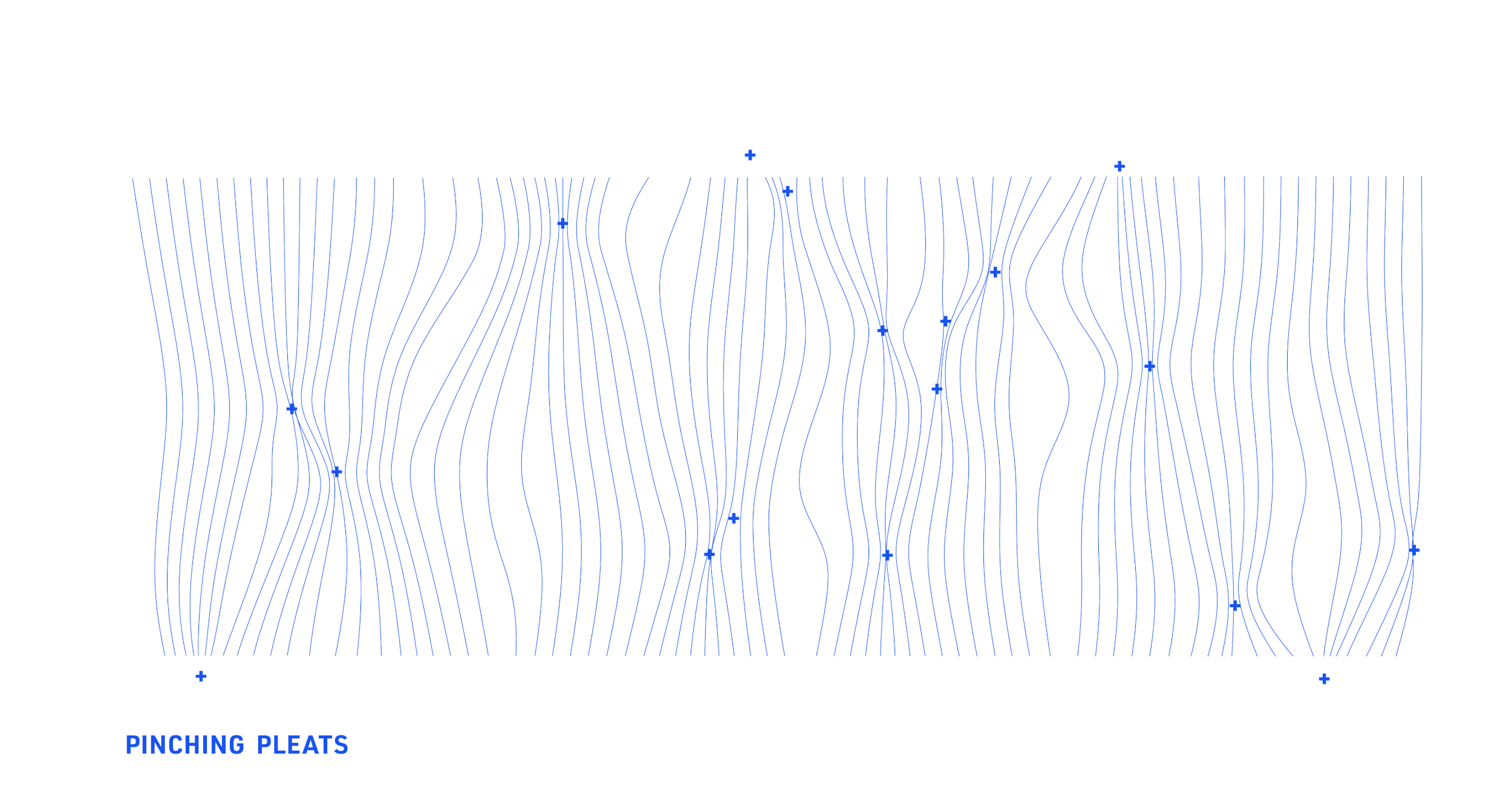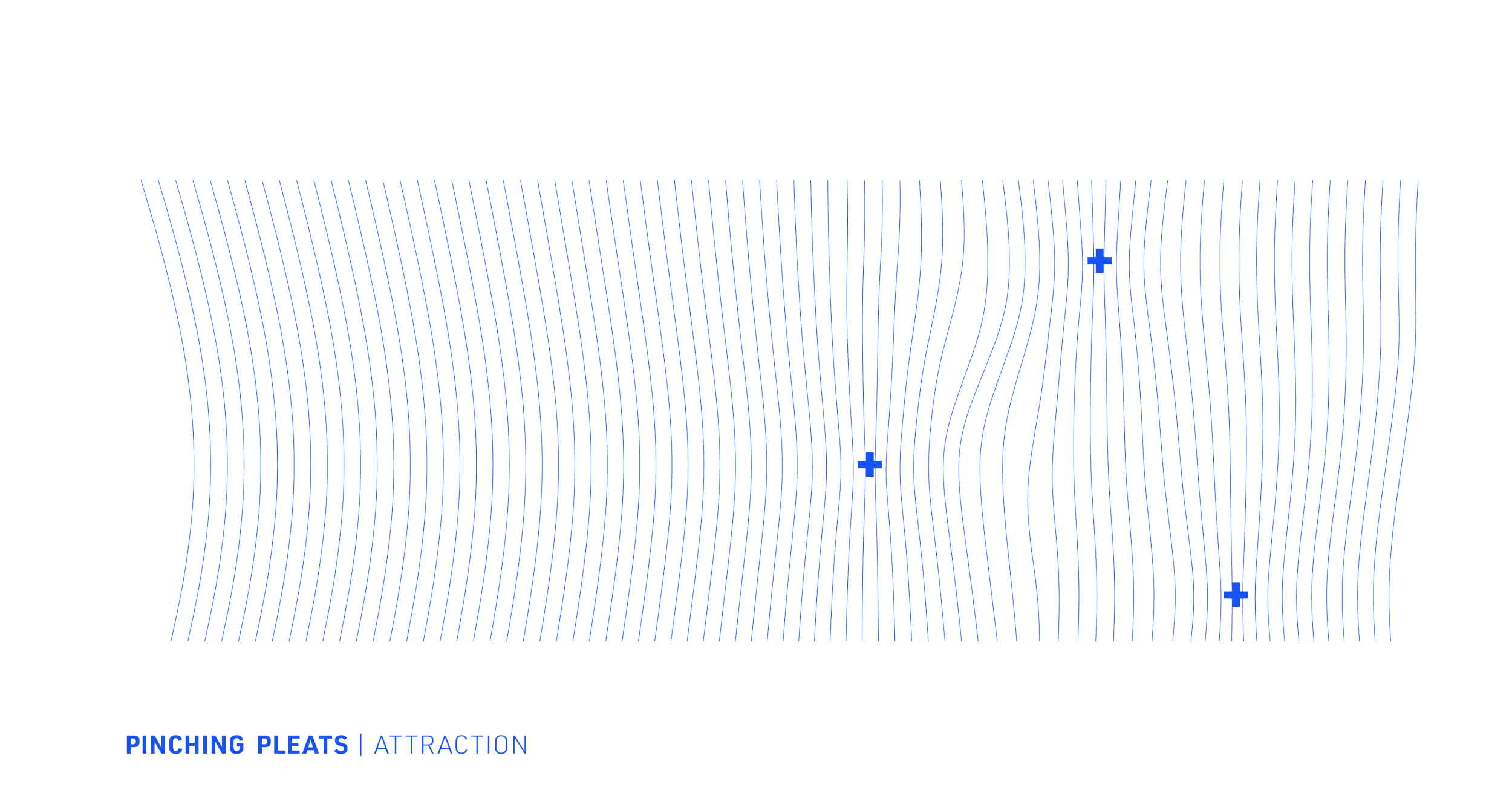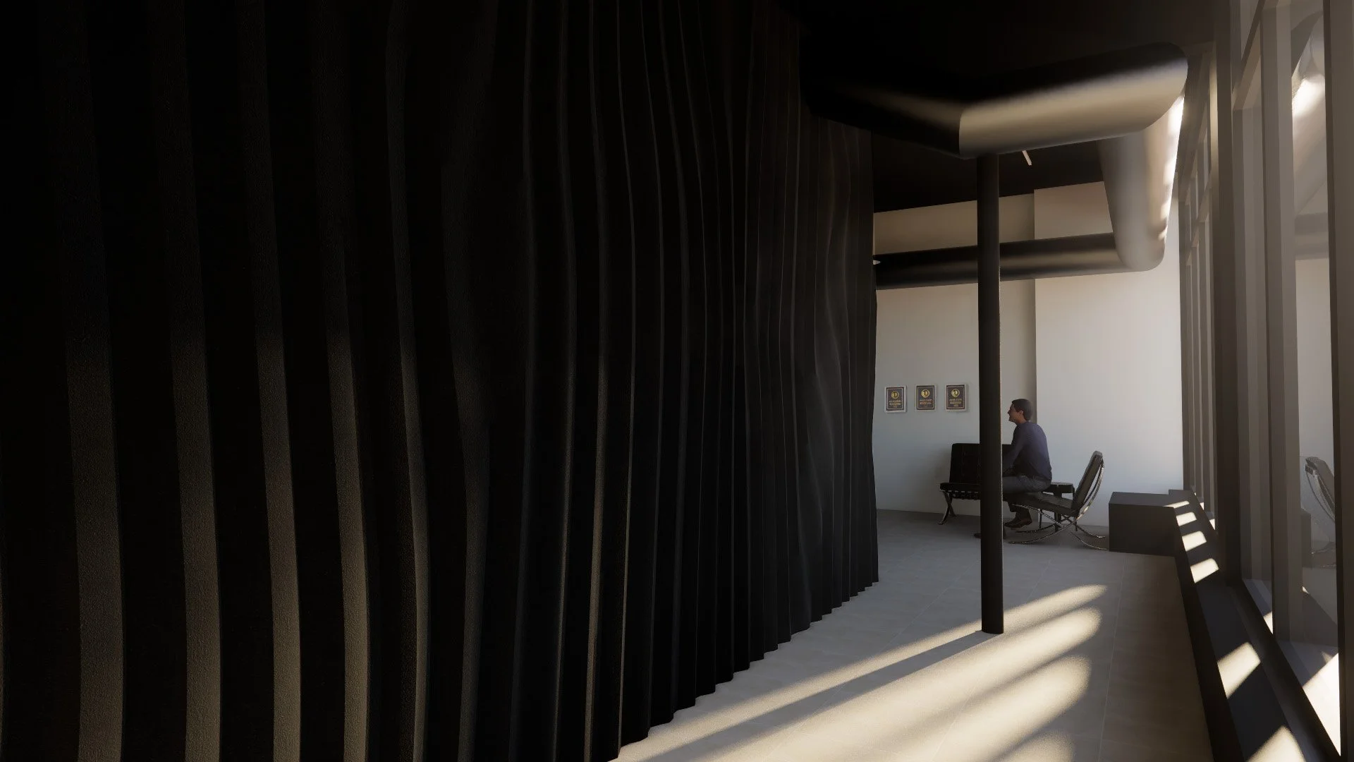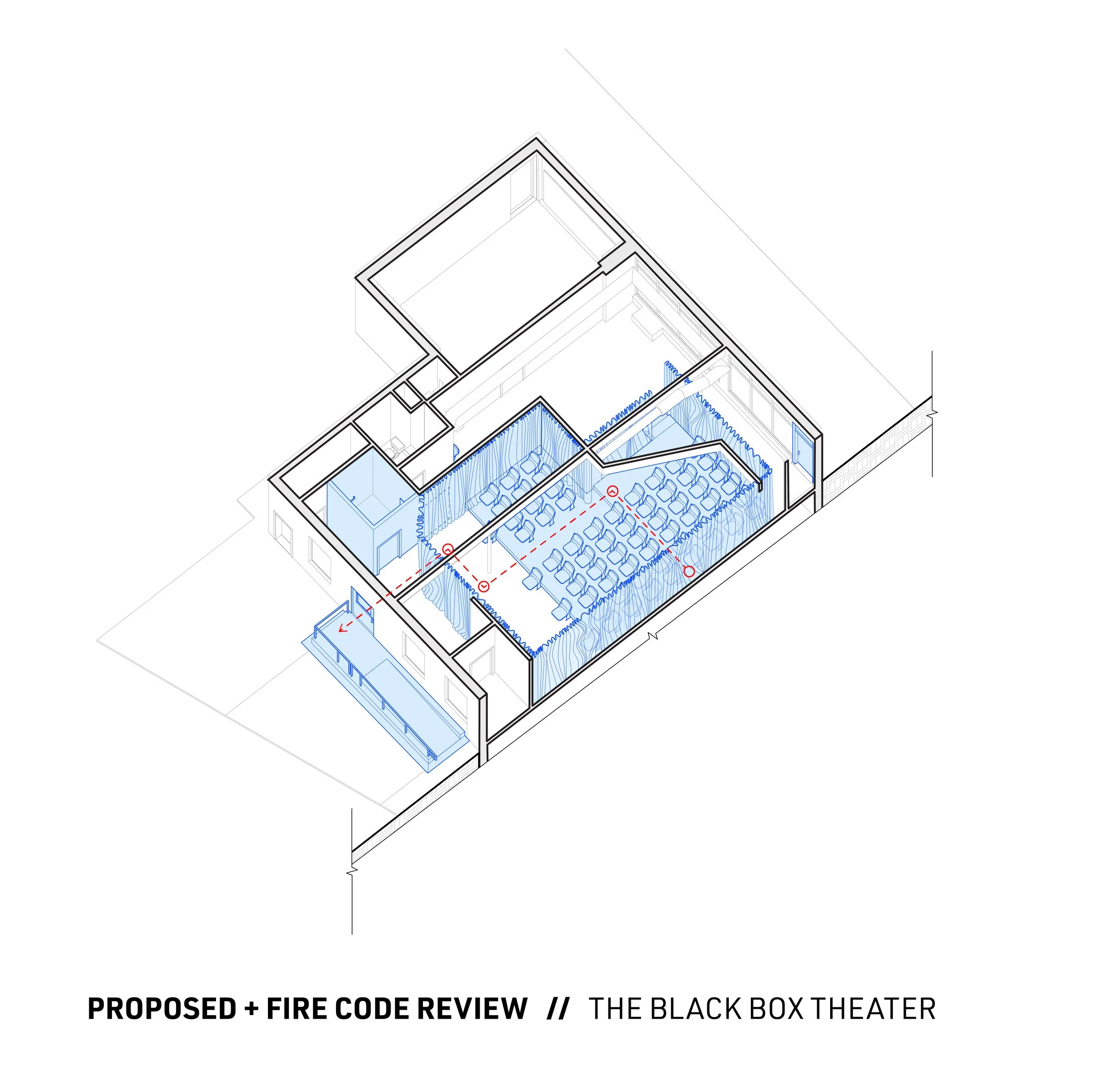 Within the theatre, a ceiling-mounted curtain defines the programmatic layout. Acting as a flexible, minimally invasive “wall,” the curtain allows the space to adapt functionally, while adding visual interest and identity. Parametrically designed, it responds to a series of intentional “pinch” points: thick acoustic fabric is pleated and threaded with thin metal cords, gathered at key intervals, and secured with rubber and metal stoppers. The undulating texture operates as a balance between the simplicity of the black box theatre and the articulated wall surface of a baroque theatre.
